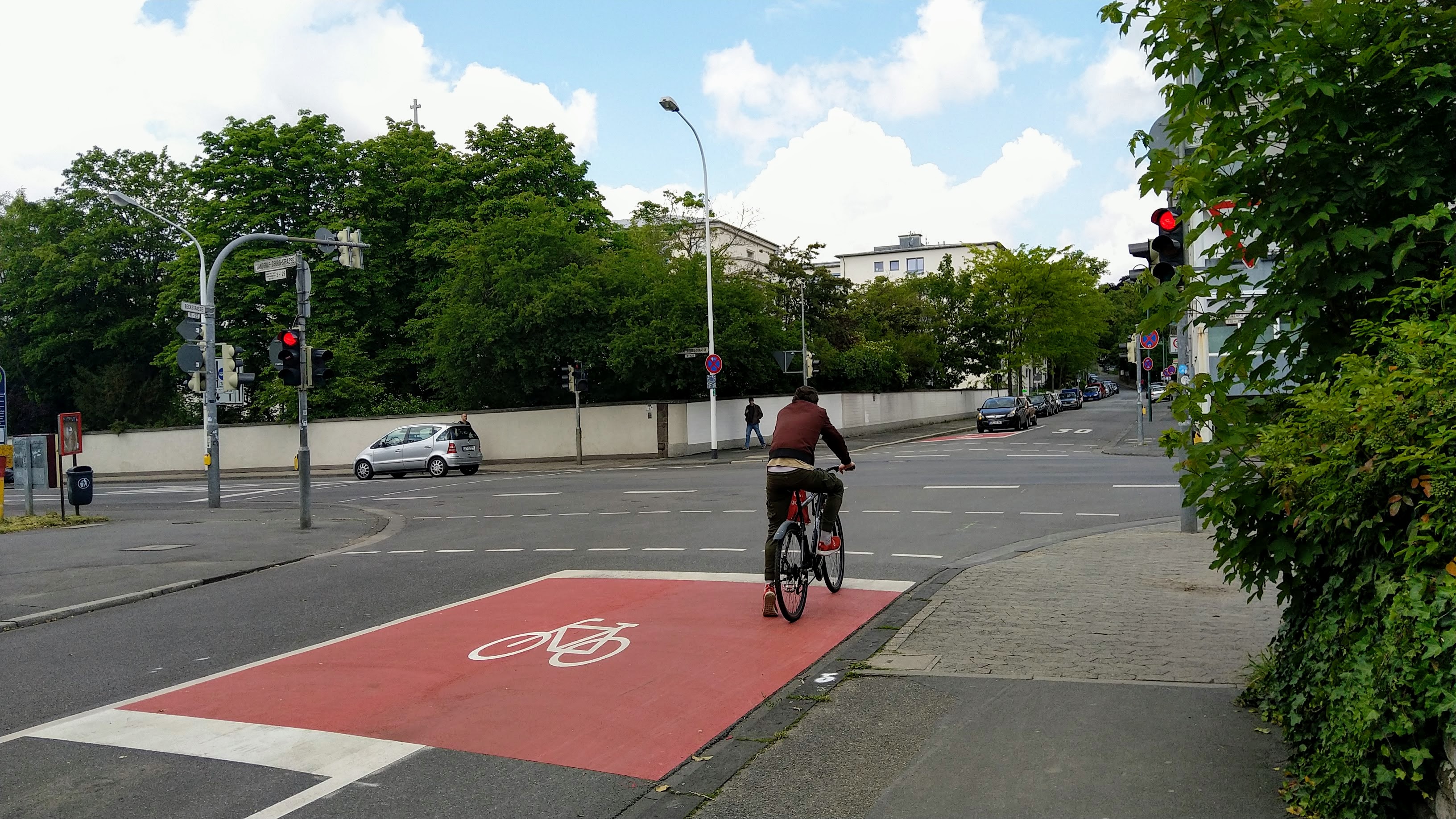 An vielen Orten sind aufgeweitete Radaufstellstreifen in den Kreuzungsbereichen markiert worden. Sie kommen ab sofort vorwiegend in der Nebenrichtung zum Einsatz, wo eine längere Ampelsperrzeit das Sortieren der Radfahrenden nach Richtung erleichtert. In der Hauptrichtung werden die Haltlinien des Kraft- und Radverkehrs lediglich gestaffelt.
