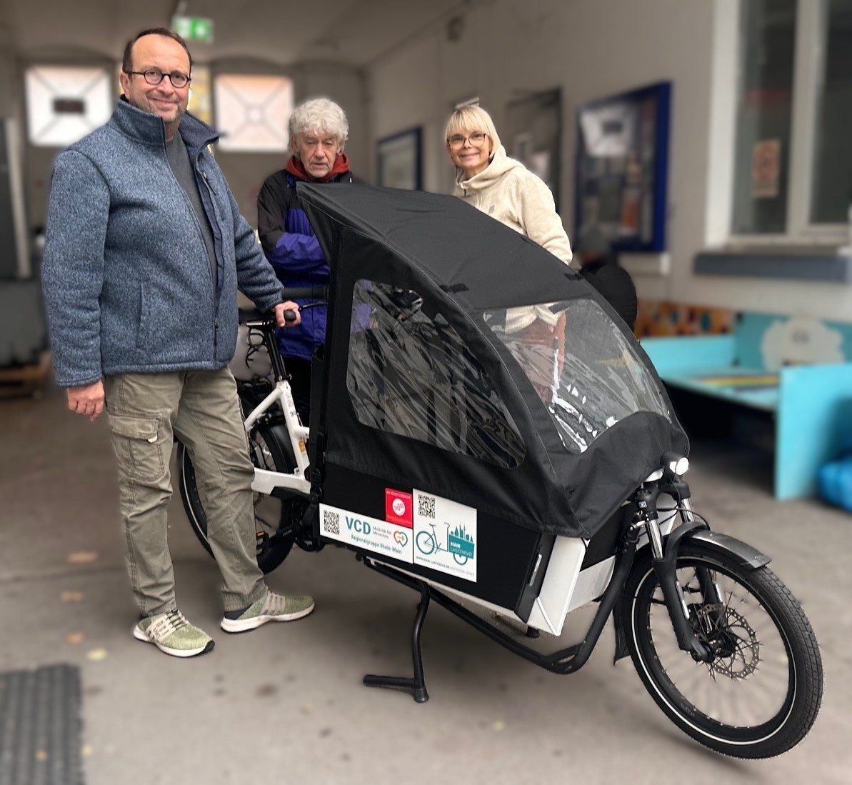 Das neue E-Lastenrad wurde von Mathias Biemann, VCD Landesverband Hessen, für den Standort Mehrgenerationenhaus Frankfurt Gallus übergeben. Otto Gebhardt, der sich ehrenamtlich für den VCD engagiert, und Bettina Jäger, vom Empfangsteam, haben sich das Lastenrad zeigen lassen.