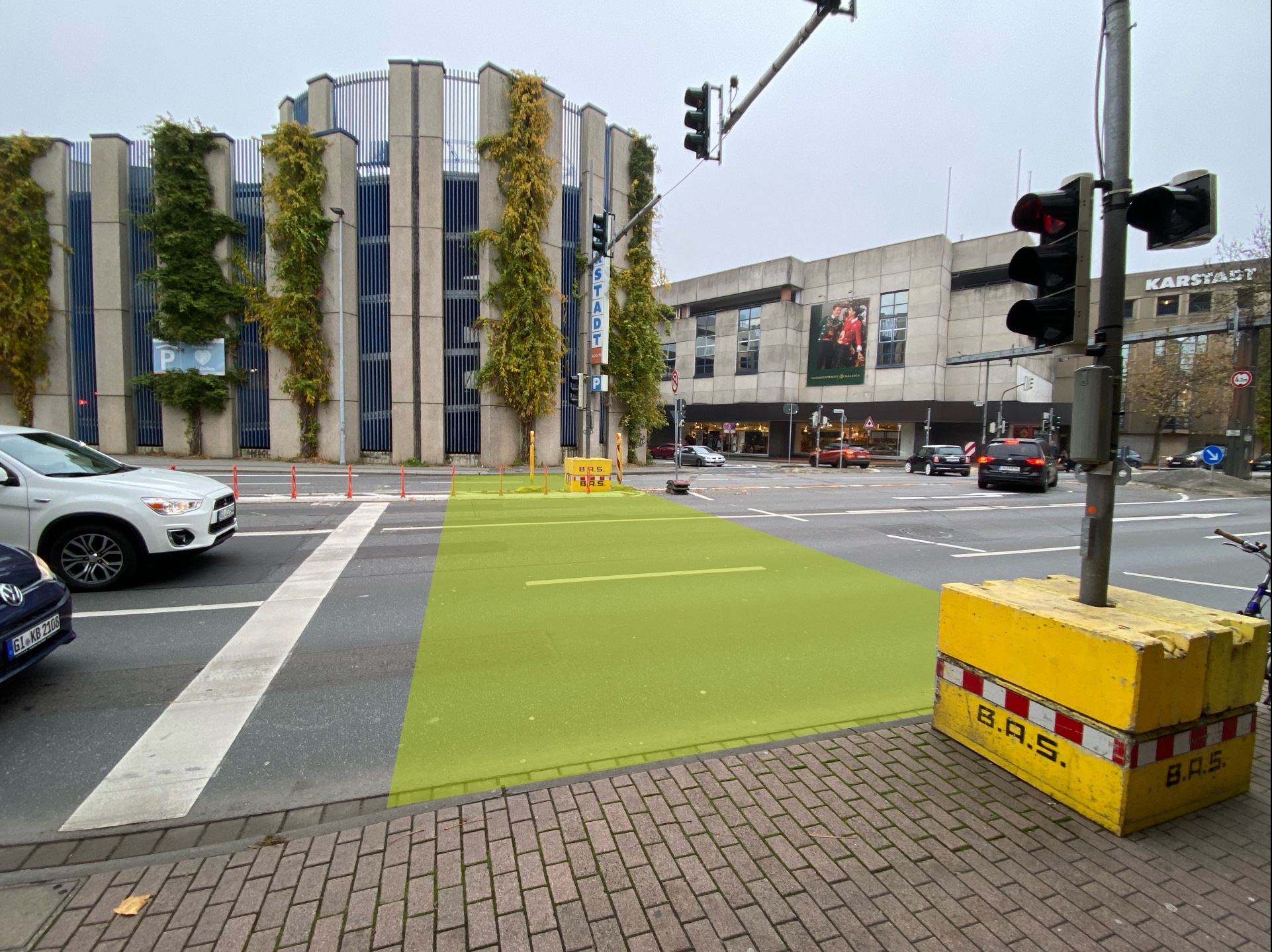 Auch an der Marburger Straße fehlt in Höhe Sudetenlandstraße die dritte Ampelquerung zwischen den beiden Supermärkten, gleiches gilt am Ludwigsplatz, am Platz der Deutschen Einheit oder dem John-F-Kennedy-Platz – allesamt wichtige Verkehrsknotenpunkte eben nicht nur für den Auto- und den Radverkehr, sondern auch für Fußgängerinnen und Fußgänger, deren Bedürfnis nach direkten, umwegefreien Verbindungen in der Praxis bis heute hartnäckig ignoriert wird.
