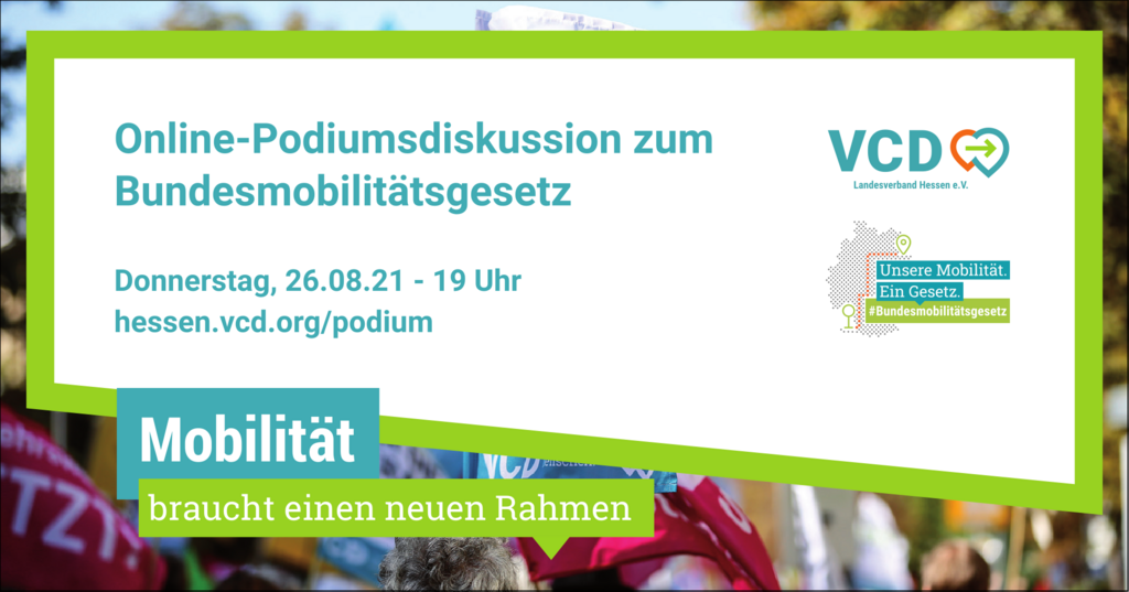 Der VCD Hessen lädt für Donnerstag, 26. August, von 19 bis 20.30 Uhr dazu ein, mit Bundestagswahlkandidatinnen und –kandidaten online darüber zu diskutieren, wie das vom VCD vorgeschlagene BuMoG eine zukunftsorientierte, menschen- und klimagerechte Mobilität ermöglichen kann. Es diskutieren Kandidat:innen und Verkehrsfachleute